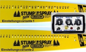 Für die Durchforstung in 25 – 40 jährigen Kiefernbeständen wird an der DROPPEN-Steuereinheit eine gleichbleibende Einstellung empfohlen. Demnach weisen eine sehr kurze Sprühzeit und die niedrigste Druckregelung sehr geringe seitliche Verluste des Pilzmittels sowie eine 100 %ige Abdeckung des Stubbens auf. Die Anzahl der geöffneten Löcher am Lochschwert (Abb. 2a) sollte hingegen an den mittleren Stock-Durchmesser des ausscheidenden Bestandes angepasst werden. Dabei ergaben sich folgende Empfehlungen: