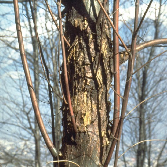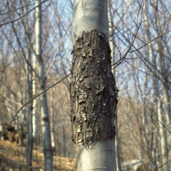 Unterhalb der Befallsstelle treiben meist Wasserreiser aus (Abb. 5). In der Rinde und im Kambium bildet der Pilz gelbliche Myzelfächer, welche ein zuverlässiges Befallsmerkmal sind (Abb. 6). Schliesslich entwickeln sich auf der abgestorbenen Rinde oder in Rindenrissen die gelb-orangen bis roten Fruchtkörperchen (Abb. 7). Hypovirulente C. parasitica-Stämme wachsen in den Äusseren Rindenteilen und erzeugen nur oberflächliche Krebse, welche rasch ausheilen. Viele der oberflächlichen, ausgeheilten Krebse weisen eine typische, schwärzliche Verfärbung auf (Abb. 8).