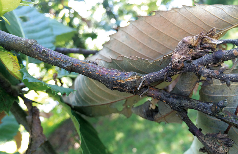 Seit sich die Edelkastaniengallwespe (Dryocosmus kuriphilus) in Europa ausbreitet, werden in den Baumkronen der Kastanien vermehrt kleine abgestorbene Äste oder Triebe beobachtet. In den meisten Fällen verursacht ein Zusammenspiel zwischen der Gallwespe und dem Kastanienrindenkrebs dieses neuartige Befallssymptom: Der Krebs dringt häufig durch verlassene Gallen der Wespe in die Zweige ein (Abb. 9) und tötet diese ab.