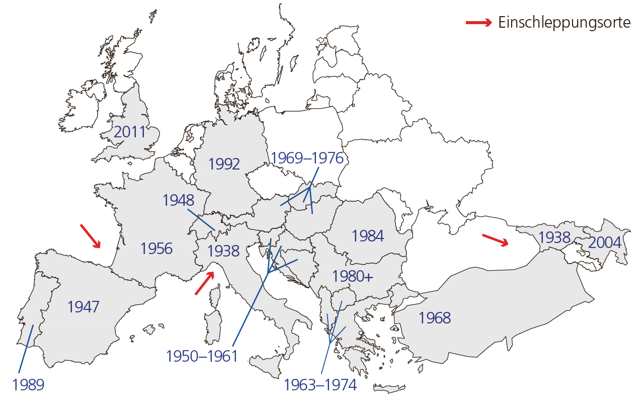 Abb. 2. Vorkommen des Kastanienrindenkrebses (Cryphonectria parasitica) im Verbreitungsgebiet der Europäischen Kastanie (Castanea sativa). Jahreszahlen geben die Zeitperiode an, in der die Krankheit zum ersten Mal festgestellt wurde. Pfeile bezeichnen mutmassliche Einschleppungsorte.