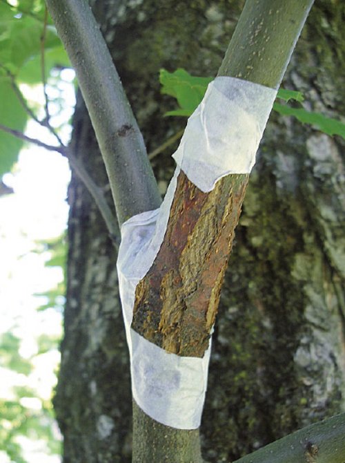 Abb. 3 - Um das Austrocknen zu verhindern, werden die Löcher mit Klebeband verschlossen. Foto: Phytopathologie WSL
