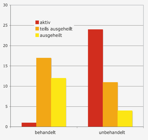 Abb. 5 - Rindenkrebse in Collonges Camping «La Châtaigneraie» im Jahr 2005: Während die meisten behandelten Rindenkrebse ausheilten, war die Mehrzahl der unbehandelten Krebse aktiv.