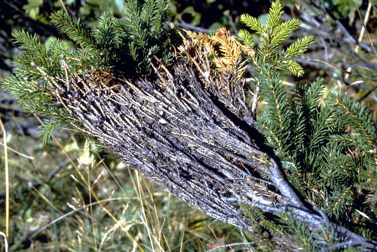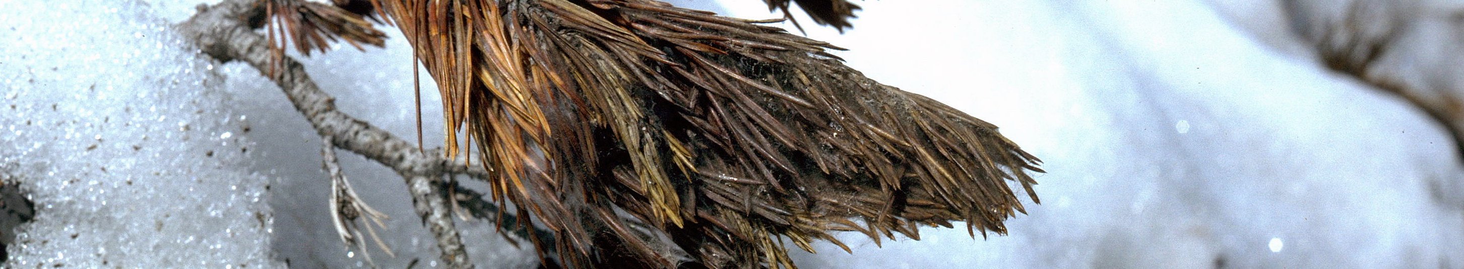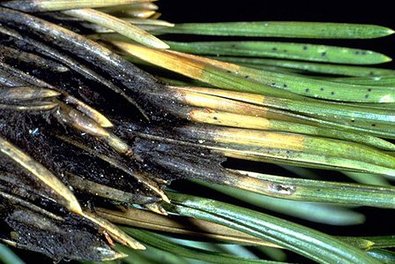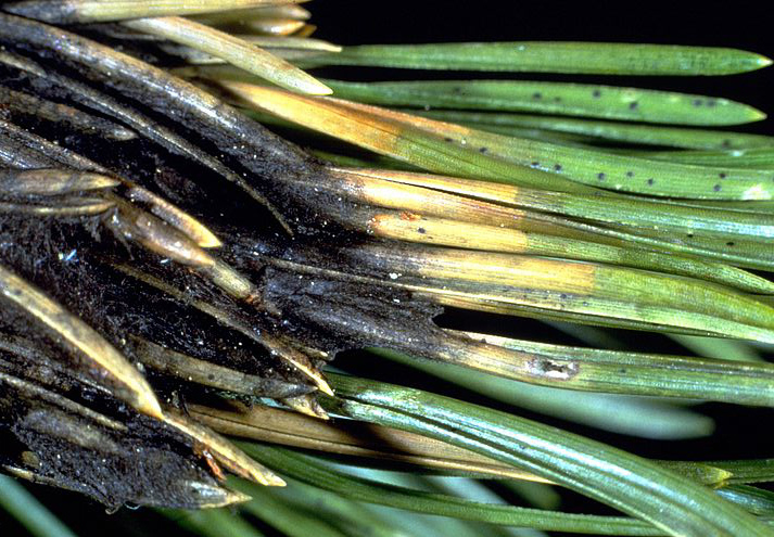 Abb. 4 - Zur Bestimmung reicht in der Regel das schwarz-braune, seidig glänzende Myzel aus, das die Nadeln umspinnt. Foto: Ottmar Holdenrider (ETHZ)