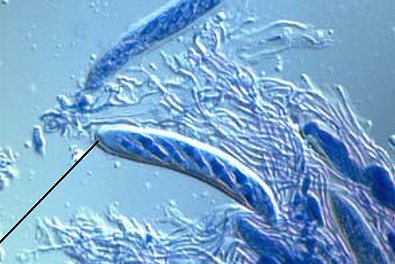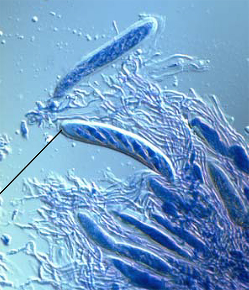 Abb. 5 - Die in den keulenförmigen Schläuchen (Asci) entwickelten Ascosporen sind zwei- bis vierzellig und 22-25 x 5-7.5 µm gross. Während der ganzen Vegetationsperiode werden die Ascosporen bei hoher Luftfeuchtigkeit empor geschleudert und mit dem Wind auf neue Wirtspflanzen übertragen. Foto: Phytopathologie WSL