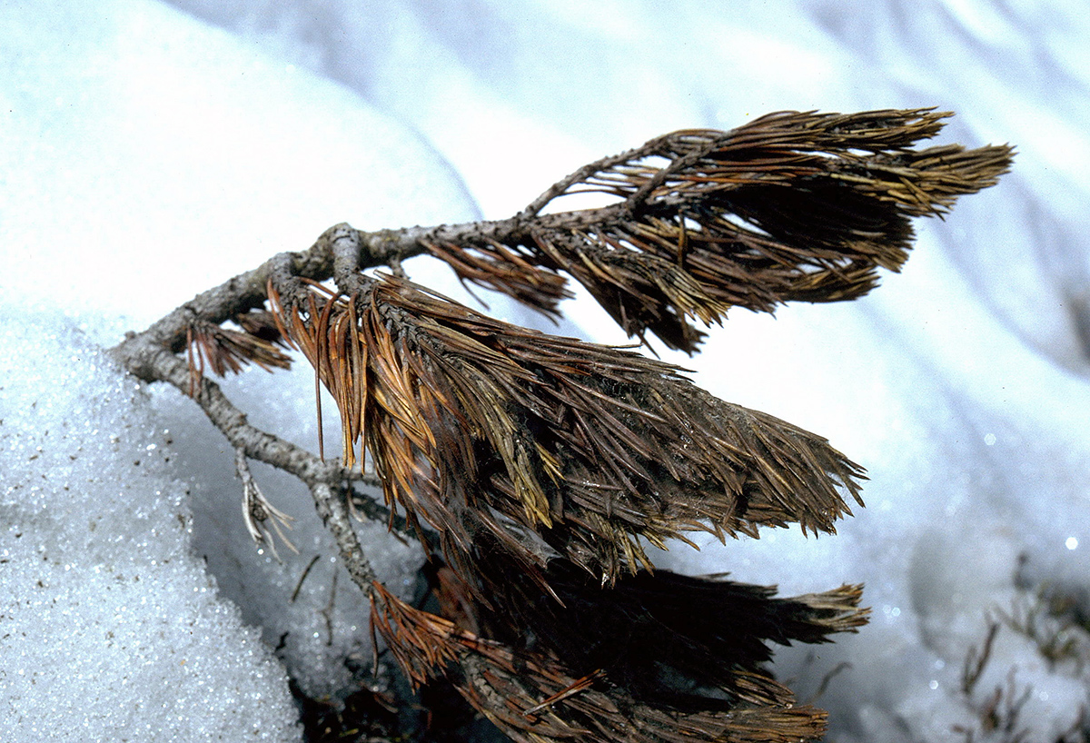 Der Schwarze Schneeschimmel gefährdet besonders geschwächte Bäumchen. Wie bei anderen Hochlagen- Pilzen trägt der Wind auch bei Herpotrichia juniperi die Sporen über weite Strecken. Die Pilze bilden an den Nadeln ein grau-schwarzes Myzel (Name!), mit dem sie benadelte Äste oder gelegentlich ganze Bäumchen dicht überziehen. Die befallenen Zweige sterben an den Folgen der Nadelzerstörung sowie an Licht- und Luftmangel ab.