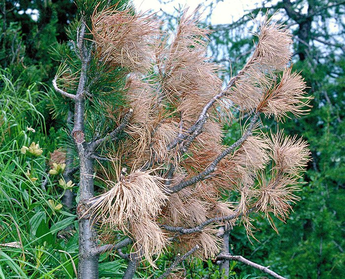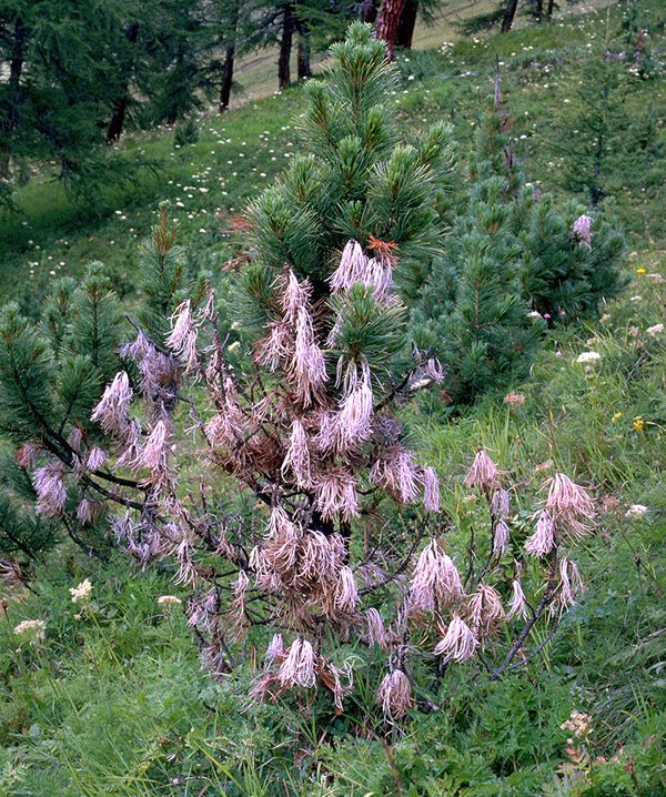 Abb. 2 - Dieses Krankheitsbild wird nach der Schneeschmelze sichtbar. Die absterbenden Nadeln haben im Frühjahr eine braun-rote Färbung und erhalten im Verlaufe des Sommers die typisch hellgraue Farbe. Foto: Ulrich Wasem (WSL)
