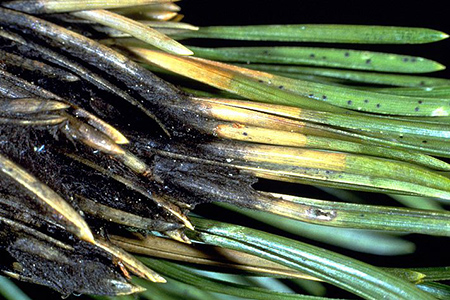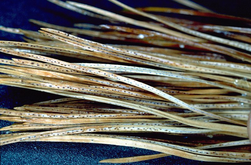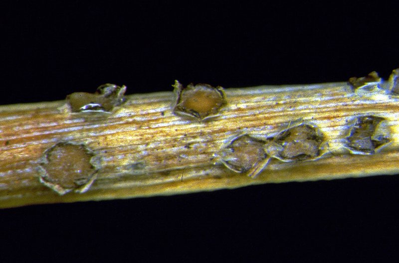 Abb. 3 - Die Fruchtkörper (Apothecien) sind als dunkelbraune bis schwarze Punkte unter der Nadelepidermis sichtbar. Foto: Ulrich Wasem (WSL)