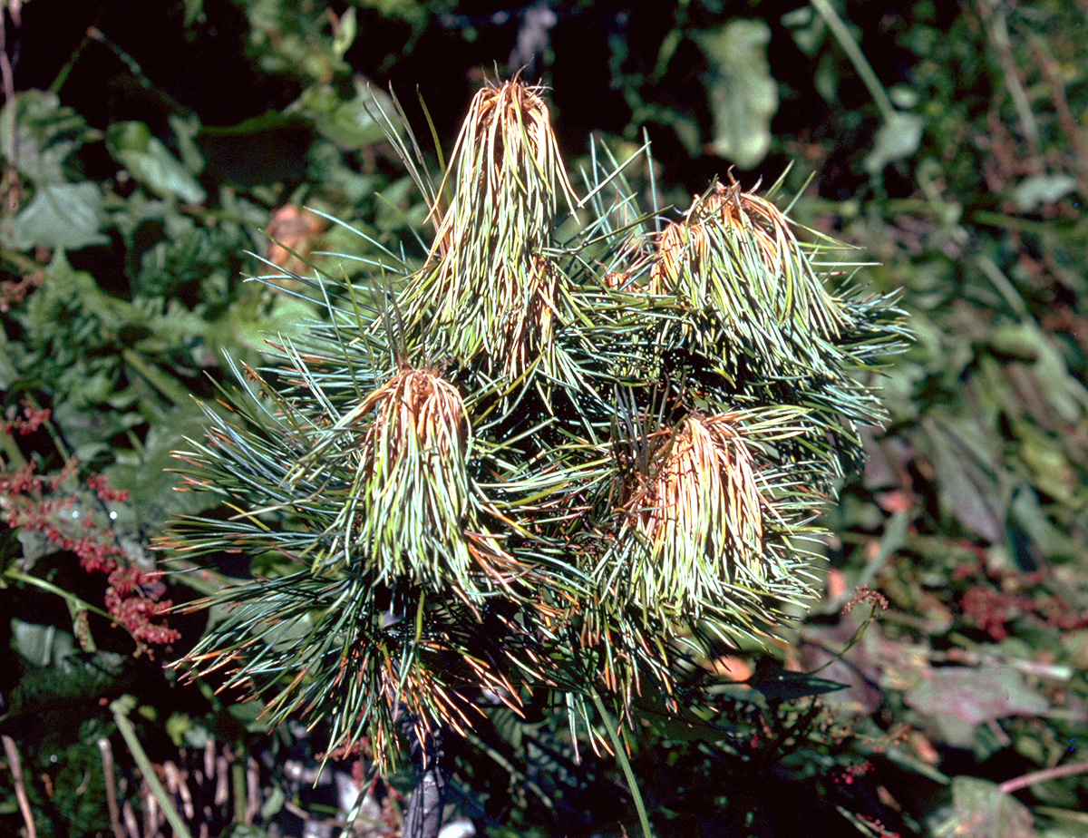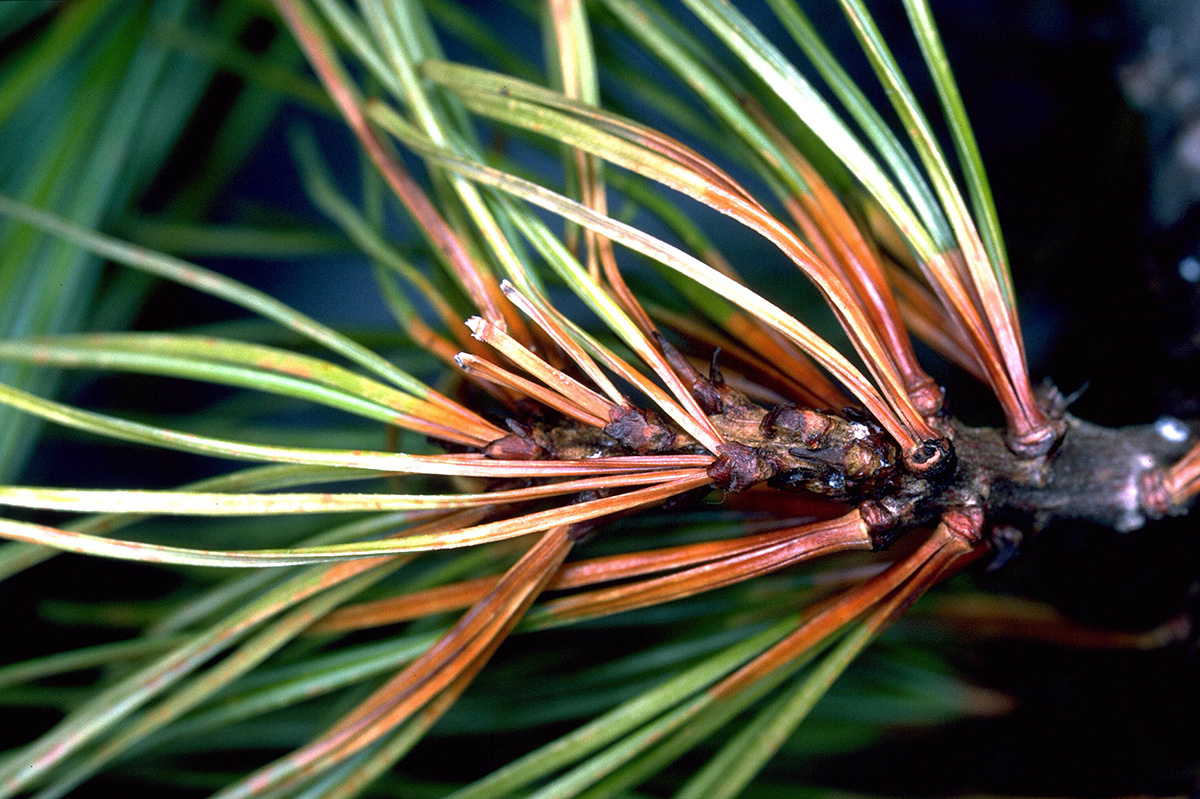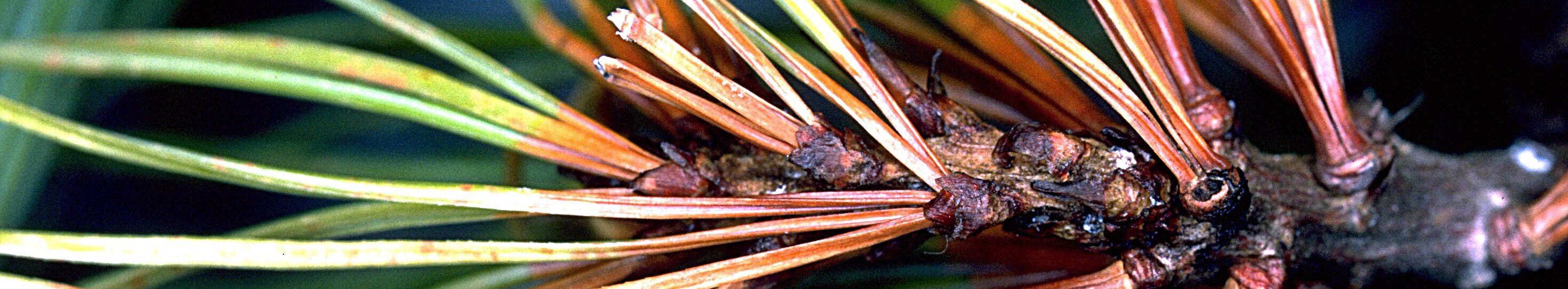 Abb. 1 - Bei sommerlichem Regenwetter verbreiten sich die Pilzsporen mit dem Spritzwasser. Der Pilz dringt durch die Spaltöffnungen der Nadeln oder über die Knospen ein und beginnt erst unter der winterlichen Schneedecke zu wachsen. Die Knospen sterben nach der Infektion ab. Foto: Walter Schönenberger (WSL)