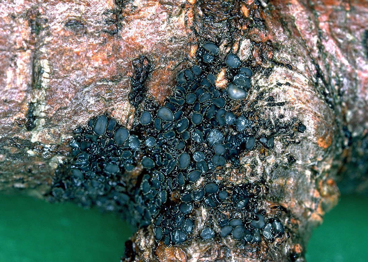 Auf den abgestorbenen Langtrieben befallener Nadelbäume entwickeln sich ein bis zwei Jahre nach der Infektion im Frühjahr nach dem Ausapern kugelige, schwarze, etwas 0,5 Millimeter grosse Fruchtkörper (Pyknidien) der Nebenfruchtform. Bei der Reife reissen sie auf und entlassen in Schleim gehüllte Sporen, die über kurze Distanzen durch Regentropfen verbreitet werden. Erst im Sommer erscheinen die dunkelbraunen bis schwarzen, 0,5 - 1,5mm grossen Fruchtkörper der Hauptfruchtform.