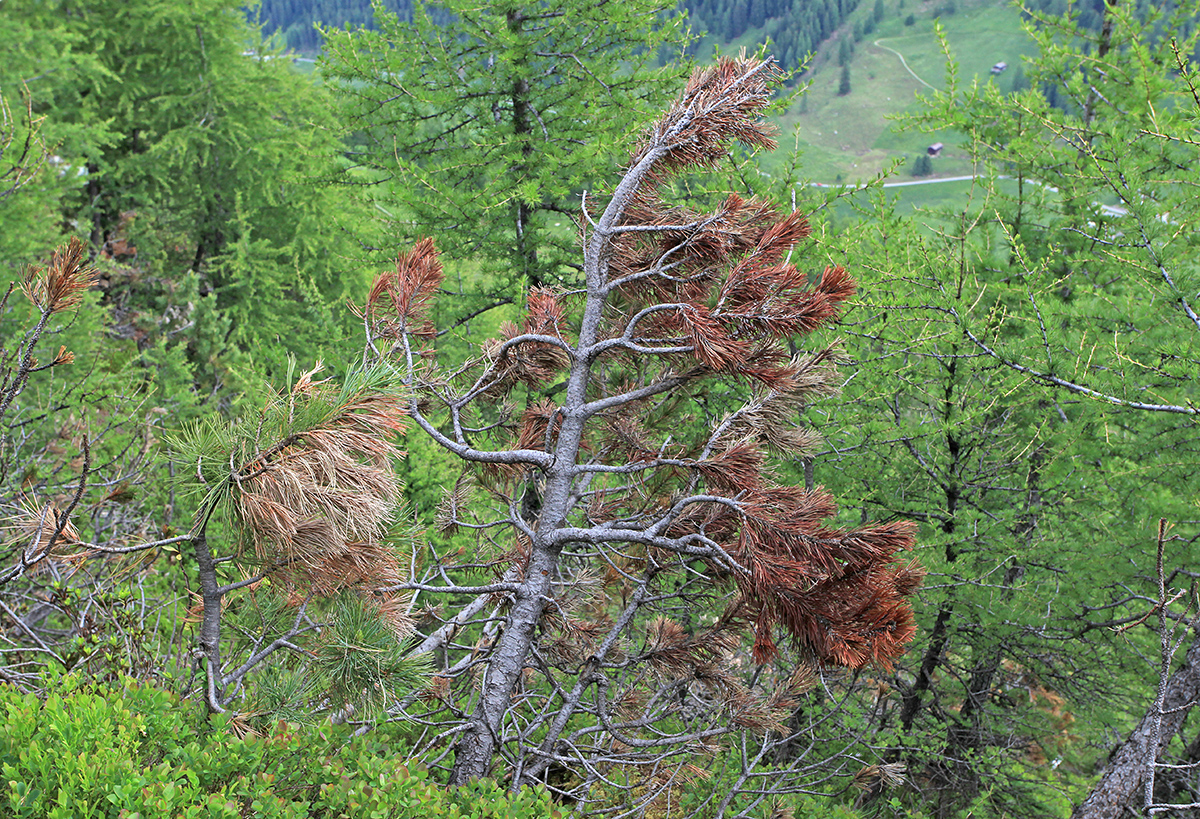 Abb. 2 - Das Bild mit den kahlen, toten Arventriebspitzen zeigt sich erst ein Jahr später. Der Pilz kann über Jahre hinweg in abgestorbenen Pflanzenteilen überdauern. Bei jungen Arven ist der Krankheitsverlauf meist tödlich. In seltenen Fällen wird eine Erholung des Baumes beobachtet. Foto: Ulrich Wasem (WSL)