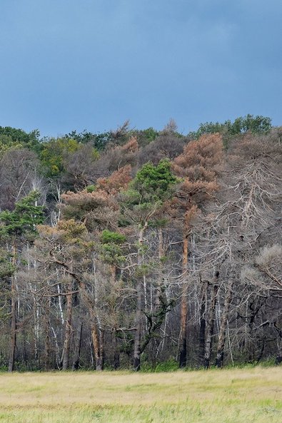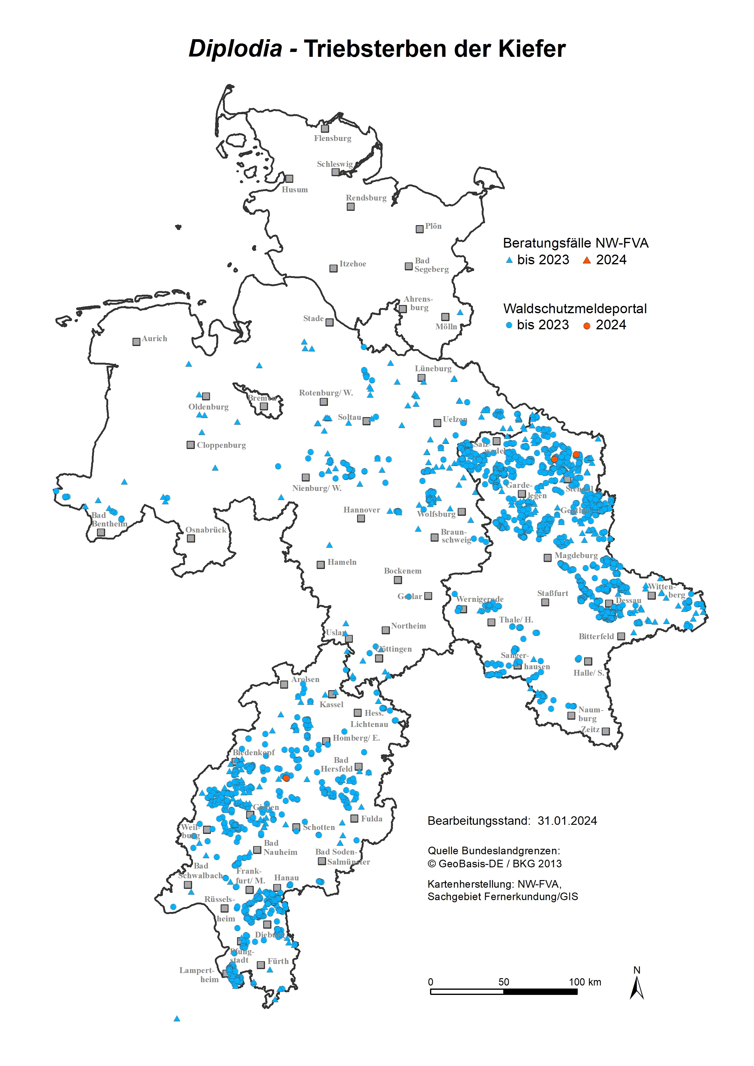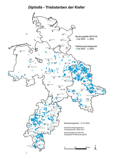 Der wärmeliebende Pilz Diplodia sapinea (Synonym: Sphaeropsis sapinea) tritt seit (ca.) 20 Jahren verstärkt in Kiefernbeständen des Zuständigkeitsgebietes der NW-FVA auf und ist auch bundesweit sehr verbreitet. Er löst erst Schäden aus, wenn der Pilz bei vorgeschädigten oder geschwächten Wirtspflanzen in seine parasitische Phase übergeht und das Diplodia-Triebsterben verursacht. Der Erkrankung geht in der Regel eine Schwächung der Kiefer voraus.