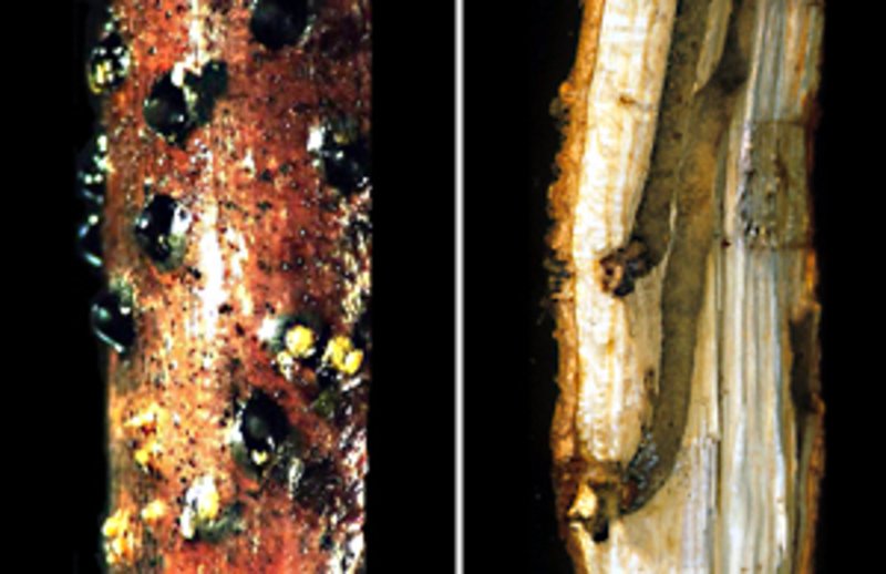 Abb. 5: links: Zweiginfektion mit Melanconis alni., rechts: Bohrgänge von Glasflüglern.