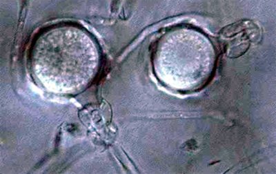 Die Gattung Phytophthora zählt zur Gruppe der "Algenpilze" und damit nicht zu den "Echten Pilzen". Eine Besonderheit dieser Gruppe sind begeißelte Zoosporen, die aktiv schwimmen können und zur Ausbreitung der Krankheit über das Wasser geeignet sind. Zur Überdauerung bilden sie typische Oosporen (Abb. 2), die im Falle von Ph. alni allerdings nicht keimfähig sind. Viele Arten dieser Gruppe sind virulente Pflanzenpathogene. Zunächst wurde der Erreger der Erlenwurzelhalsfäule 1993 in Großbritannien entdeckt und als Hybrid Ph. cambivora x fragariae beschrieben worden. Erst 2004 erhielt er den Namen Ph. alni Brasier. In der Natur werden ausschließlich Erlen befallen, überwiegend die Roterle, A. glutinosa.