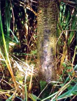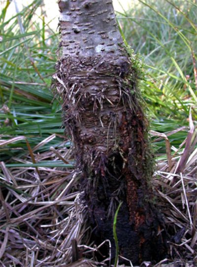 Schwerpunkt der Verbreitung sind Flussauen, die zeitweise überflutet werden. Je mehr die Bestände stagnierendem oder langsam fließendem Wasser ausgesetzt sind, um so höher steigt auch ihre Erkrankungswahrscheinlichkeit. Hier bilden die Erlen am Wurzelhals oft typische Adventivwurzeln aus (Abb. 3). Erlen, die nur auf geringfügig höherem Niveau stocken, erkranken seltener. Erlen am Oberlauf von schnell fließenden Gewässern sind kaum bedroht. Die Primärinfektion kann aus dem Wasser flussaufwärts stammen, möglicherweise von gepflanzten Erlen aus infiziertem Baumschulmaterial.