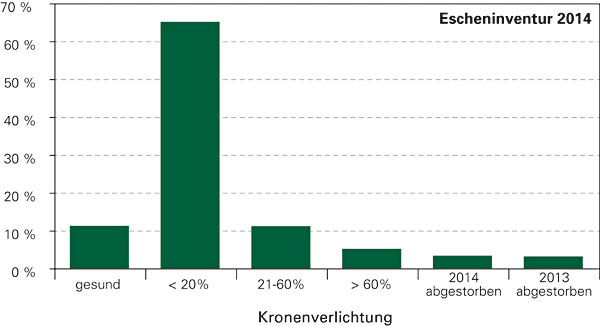 Zunehmende Kronenschäden waren im Sommer 2014 Anlass für eine Stichproben-Inventur von rund 6.000 Eschenkronen. Das Ergebnis schien erfreulich. Rund zwei Drittel der Eschen wiesen nur geringe Blattverluste auf (Abbildung 2).