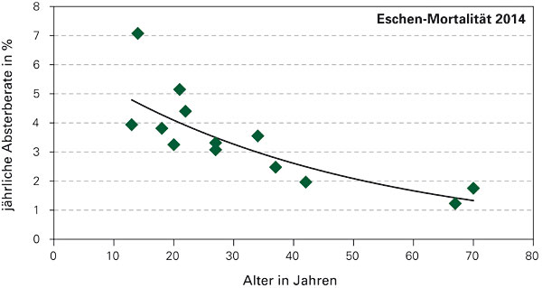 Die Betrachtung der Mortalität lieferte jedoch ein anderes Bild (Abbildung 2 und 3). Jährliche Absterberaten von 1 bis 7 %, deutlich höher bei jüngeren Bäumen, ließen mittelfristig eine dramatische Entwicklung befürchten. Die bereits einige Jahre zuvor begonnene rasche Aufarbeitung geschädigter Eschen wurde daher intensiv weitergeführt. Diese frühe und konsequente Aufarbeitung dürfte die Erklärung für die vergleichsweise geringen Anteile stark verlichteter Kronen bei der Schadensinventur sein.