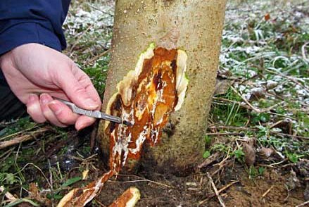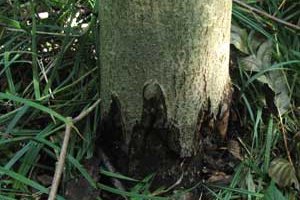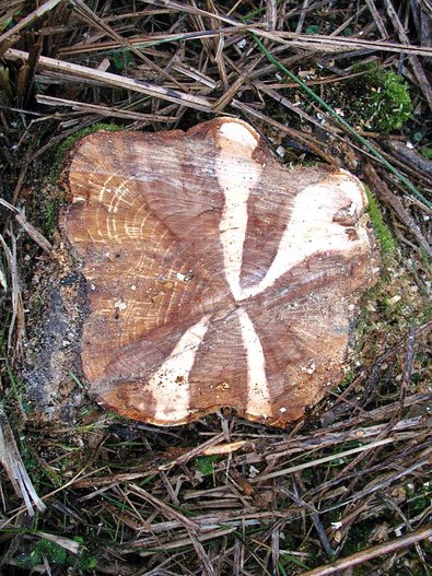 Abb. 2: Durch Stammfußnekrosen entstandene Holzverfärbung