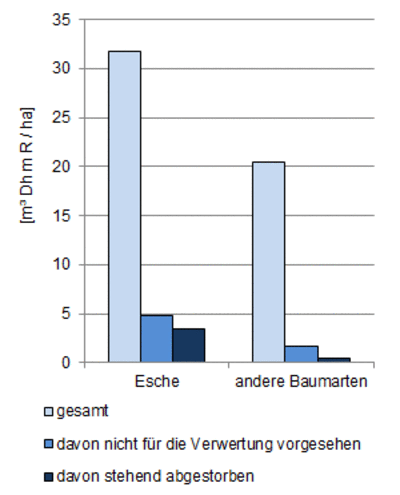 Es ist davon auszugehen, dass etwa ein Drittel des jetzigen Eschenvorratsvolumens innerhalb weniger Jahre genutzt werden muss oder absterben wird. Dies wird die Forstbetriebe vor gewaltige Herausforderungen stellen, da es bei wertvolleren Bäumen gilt, das Holz zu ernten, bevor es zu einer Entwertung kommt. Diese Problematik zeigt sich auch durch den Anteil der stehend abgestorbenen oder gefällt aber nicht zur Verwertung vorgesehenen Bäume, der für die Esche sehr hoch war.