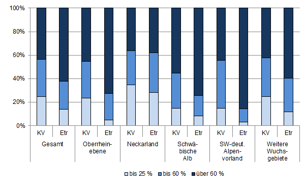 Abb. 3: Prozentuale Anteile des Vorrats der Esche nach Klassen der Kronenverlichtung (KV) und des Ersatztriebanteiles (ETr) für das gesamte Land und für einzelne Wuchsgebiete. Unter "Weitere Wuchsgebiete" sind der Schwarzwald, der Odenwald und das Wuchsgebiet Baar-Wutach zusammengefasst.