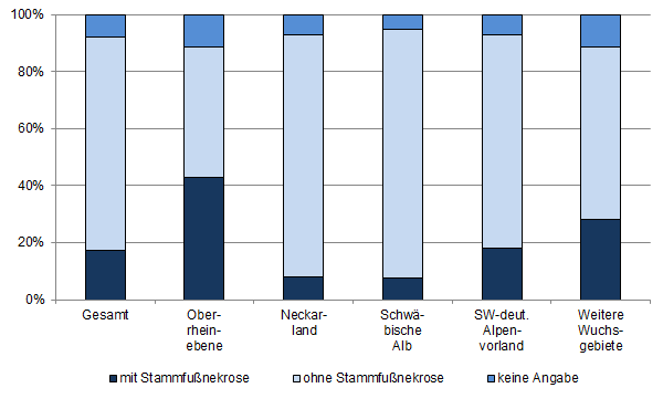 Gleichzeitig muss bei der Nutzung von abgängigen Eschen besonders auf die Arbeitssicherheit geachtet werden, die durch Stammfußnekrosen und abgestorbene Kronenteile gefährdet ist. Der Anteil des Eschenvorratsvolumens von Eschen mit Stammfußnekrosen lag im Mittel bei 17,5% und war in der Oberrheinebene besonders hoch. Das Wuchsgebiet Neckarland ist hingegen am wenigsten vom Eschentriebsterben betroffen. Hier gab es vergleichsweise wenige Stammfußnekrosen, aber vor allem die Kronenschäden waren hier deutlich geringer als in anderen Wuchsgebieten Baden-Württembergs.