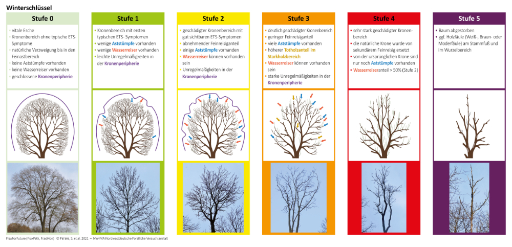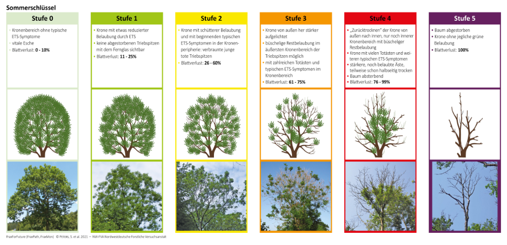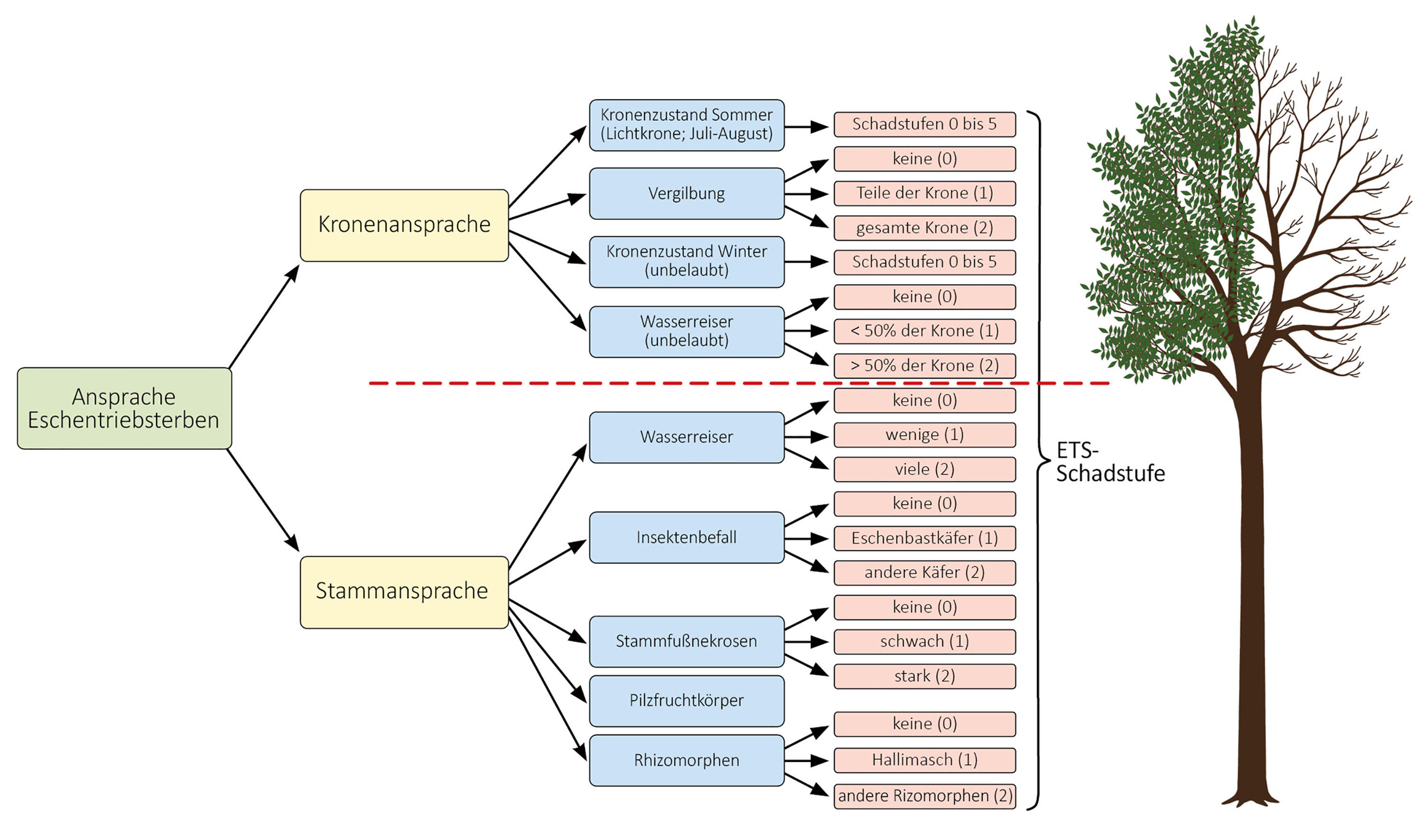 Da nur ein geringer Teil der Gemeinen Eschen gegenüber dem Erreger tolerant zu sein scheint und eine Neuanpflanzung des bisherigen Pflanzgutes nicht empfohlen werden kann, ist die forstliche Zukunft dieser Baumart aktuell ungewiss. Zur Schadenserhebung und zum Monitoring des Eschentriebsterbens wurden bisher unterschiedliche Ansätze der Kronenansprache entwickelt und angewendet. Die Symptomatik des Eschentriebsterbens ist hoch variabel und zeigt sich in unterschiedlichen Baumkompartimenten von der Wurzel bis in die Krone. Daher waren die bisherigen Schlüssel zur Kronenansprache nicht ausreichend, um das Schadausmaß bei Einzelbäumen zu erfassen und Risiken, z.B. zur Verkehrssicherheit betroffener Eschen abschätzen zu können.