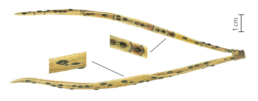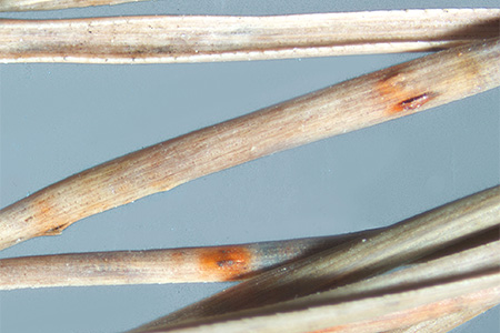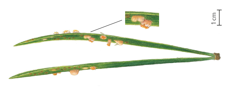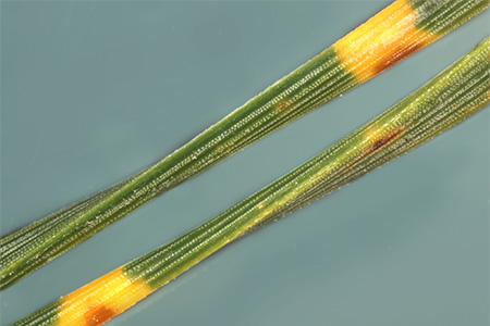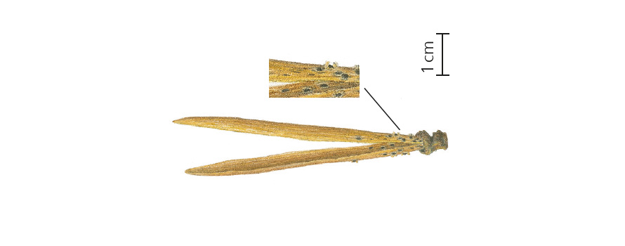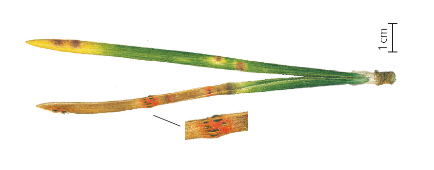 Von allen hier beschriebenen Föhrenarten ist die Bergföhre am stärksten von der Braunfleckenkrankheit betroffen (Abb. 3, Bergföhre). Zusammen mit der Rotbandkrankheit machen diese beiden eingeschleppten Krankheiten mehr als 75 Prozent der beobachteten Befälle an Bergföhre aus. Am dritthäufigsten trat die Physiologische Nadelschütte auf.