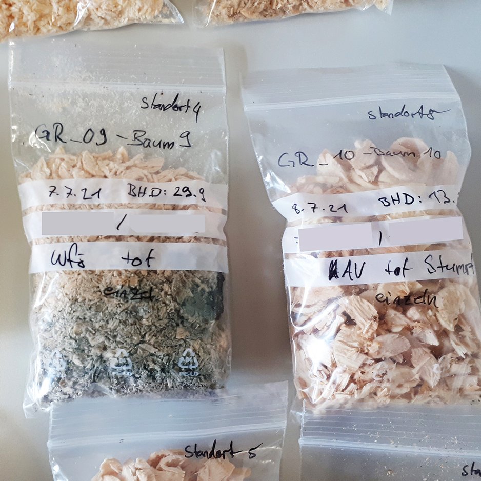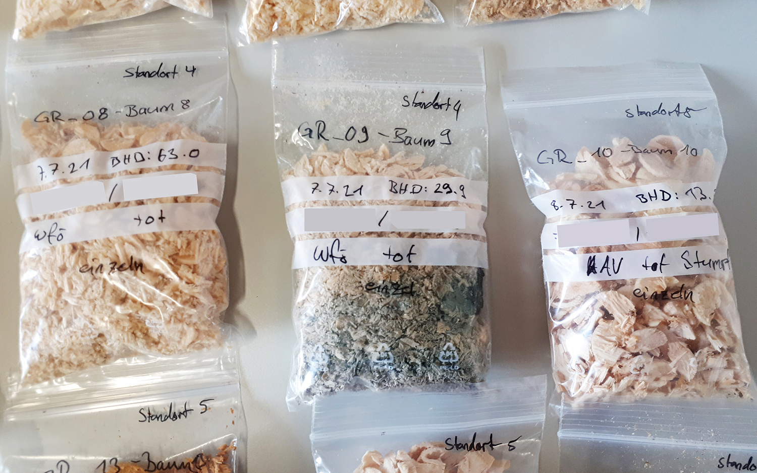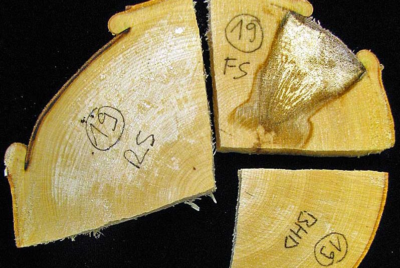 Von 78 Bäumen wiesen 55 eine Holzverfärbung im Splint auf (Tab. 1). Aus 54 Bäumen konnten die Wissenschaftler mit einem Nährmedium Pilze isolieren. Dabei zeigte sich: Aus verfärbtem Splintholz wuchsen fünfmal so häufig Pilze wie aus unverfärbtem.
