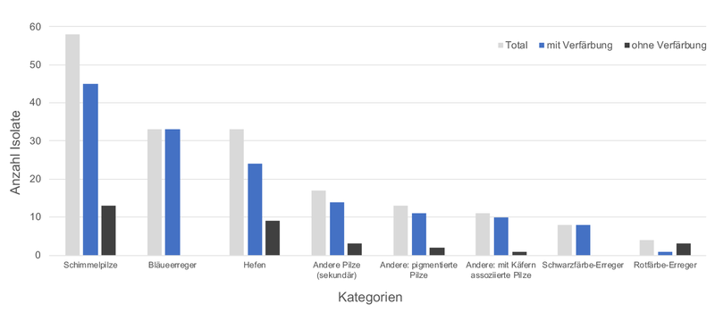 Am häufigsten waren Pilze aus der Kategorie der Schimmelpilze (Gattungen Penicillium, Trichoderma, Mucor und Alternaria). Sie machten rund 31 % aller Isolate aus verfärbtem, bzw. 41 % aller Isolate aus nicht verfärbtem Holz aus. Am zweithäufigsten waren bekannte Bläuepilze. Sie wurden nur aus verfärbtem Holz isoliert (23 %) und enthielten Ceratocystis-, Ophiostoma- und Grosmannia-Arten. Hefen wurden ebenfalls häufig gefunden. Sie waren in nicht verfärbtem Holz etwas häufiger (29 % gegenüber 16 % in verfärbtem Holz).