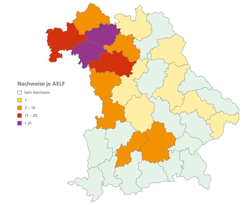 In Bayern: In Bayern konnte die Rußrindenkrankheit erstmals im Sommer 2018 in Wäldern auf der Fränkischen Platte im Raum Würzburg (Abbildung 2) detektiert werden. Hier wurde die Krankheit in Bergahornbeständen sowie an Einzelbäumen und Baumgruppen in Wald- und Stadtgebieten beobachtet. Während der Hitze- und Trockenjahre 2018 /19 setzte eine hohe Schaddynamik ein. Zunehmende Funde außerhalb dieser Region deuten darauf hin, dass der Pilz bereits sehr weit verbreitet ist. Mittlerweile konnte die Erkrankung in vielen bayerischen Waldgebieten nachgewiesen werden, wobei außerhalb des Schadensgebietes in Unterfranken eher Einzelbäume oder Baumgruppen betroffen sind. Vereinzelt wurde eine Ausbildung der rußartigen Sporenlager auf gelagerten Brennholzpoltern festgestellt, ohne dass Schäden im Wald auftraten.