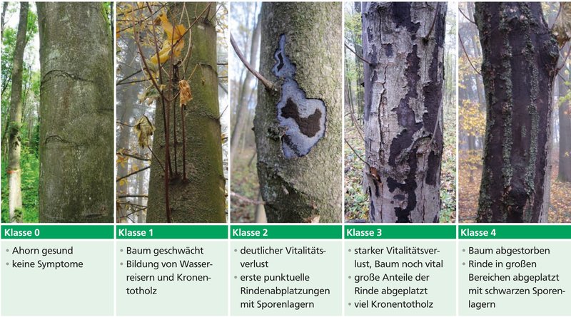 Insgesamt konnte bei jüngeren Bergahornen ein schnelleres Voranschreiten der Schaddynamik festgestellt werden als bei älteren Bäumen. Da auch ältere Bergahorne befallen werden und absterben, könnte die verzögerte Symptomausprägung in einer längeren Latenzzeit begründet sein.