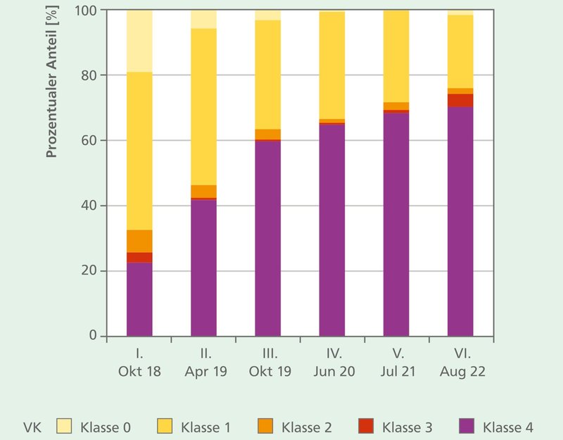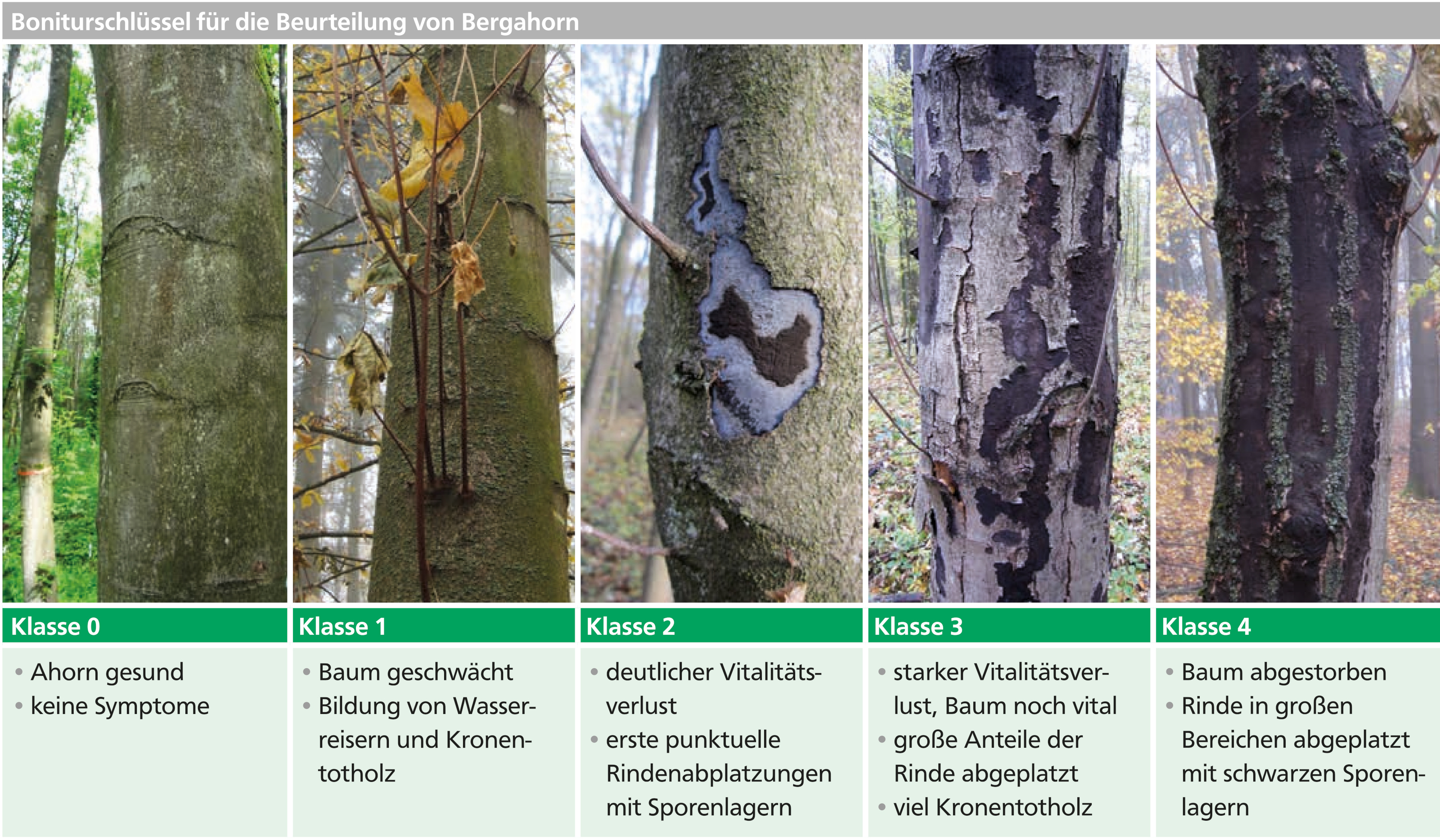 In vier Untersuchungsflächen im Raum Unterfranken wurde seit 2018 ein schnelles Voranschreiten der Schaddynamik durch die Rußrindenkrankheit bei Bergahorn festgestellt. Die Bäume wurden mindestens einmal jährlich auf ihre Vitalität und zunehmende Symptome der Erkrankung hin beurteilt (Abbildung 3).