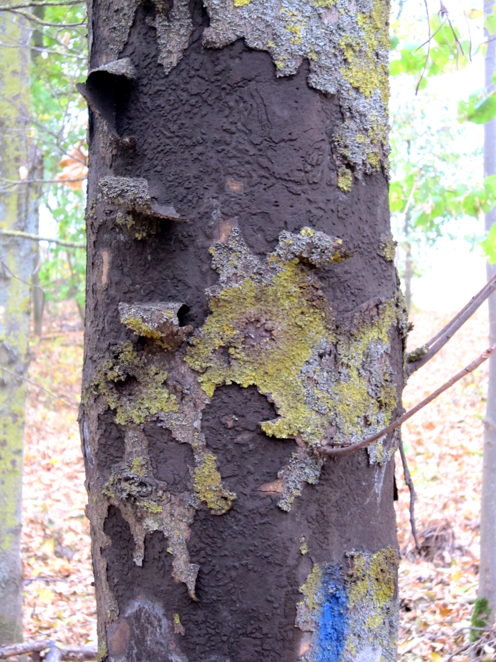Die meist großflächigen rußartigen Sporenlager werden mit mehr als 100 Millionen Sporen pro Quadratzentimeter in einer mehrere Millimeter dicken Schicht ausgebildet. Das Absterben des Baumes erfolgt bei voranschreitender Entwicklung der Sporenlager innerhalb weniger Wochen oder Monate. Nach Bildung der flächigen Sporenlager ist keine Regeneration des Baumes mehr möglich. In später Folge zur Freisetzung der Sporen unter der aufplatzenden Rinde können nach neuen Beobachtungen nochmals nach mehreren Jahren Sporenlager in tieferen Jahrringen ausgebildet werden (Abbildung 1d).