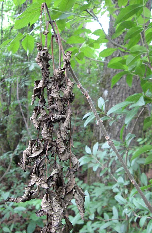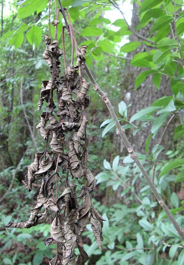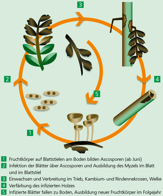 Erste Anzeichen des Eschentriebsterbens sind unregelmäßige Farbveränderungen an den Blattspreiten (Abb. 2). Deutlich später werden braune Rindennekrosen an den Trieben sichtbar, die im unbelaubten Zustand sehr deutlich zu erkennen sind (Abb. 3). Triebumfassende Rindennekrosen unterbrechen die Wasserversorgung des Astes, so dass Pflanzenteile oberhalb der Nekrose welken und absterben (Abb. 4). Die Blätter bleiben noch längere Zeit am Zweig hängen. Unterhalb dieser Nekrosen treiben schlafende Knospen aus und führen so zu einer Verbuschung der Krone (Abb. 5). Die so geschwächten Bäume werden anfälliger für sekundäre Schadorganismen, wie Hallimasch und Eschenbastkäfer.