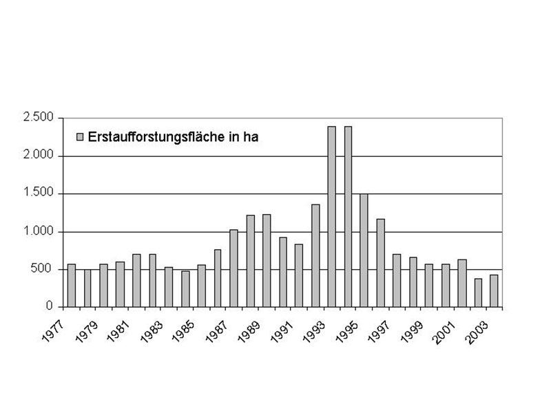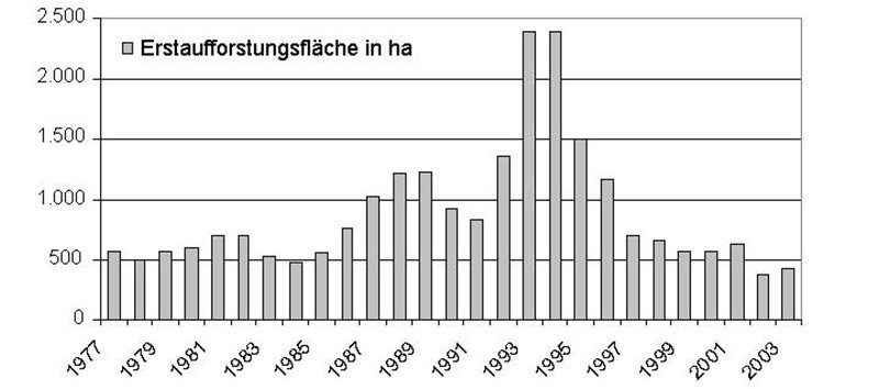 Auch der Brotbaum der bayerischen Forstwirtschaft, die Fichte, spielte bei den Aufforstungen eine große Rolle. Insgesamt wurden seit 1977 in Bayern rund 24.000 ha Wald aufgeforstet (Abb. 4). Legt man die Ergebnisse der Bundeswaldinventur für die Erstaufforstungen von 1988 bis 2002 zugrunde, erreicht die Fichte einen Anteil von 27,5 % an der Gesamtbestockung.