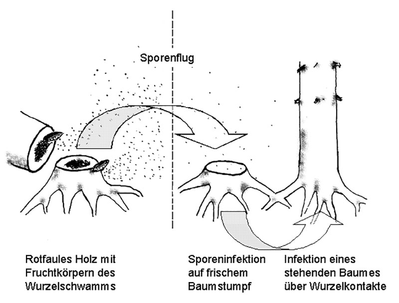 Neben Wundfäule und Hallimasch ist der Wurzelschwamm (Heterobasidion annosum) der mit Abstand wichtigste Erreger der Rotfäule. Dieser Pilz besiedelt frische Baumstümpfe und dringt von dort aus über Wurzelverwachsungen mit einer Geschwindigkeit von ca. 50 cm pro Jahr in gesunde Bäume ein.
