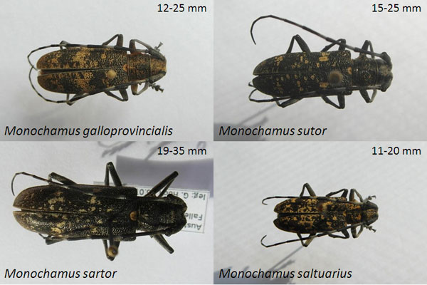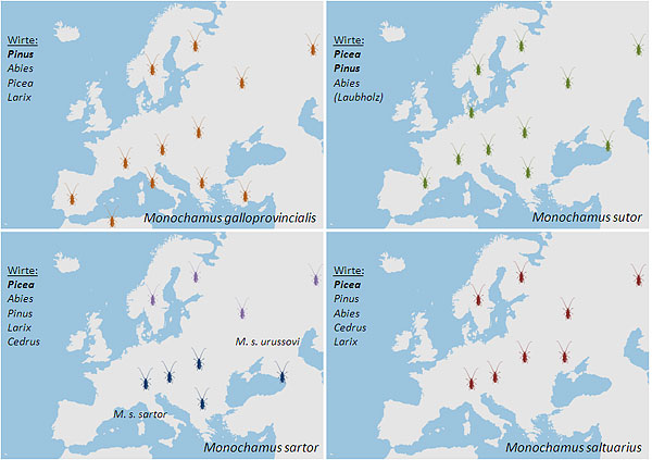 In Europa kommen fünf Arten der Gattung Monochamus vor, namentlich M. galloprovincialis, M. sutor, M. sartor (M. sartor sartor und M. sartor urussowi), M. saltuarius und M. impluviatus (Wallin et al. 2013). Die ersten vier Arten kommen in Österreich vor (Abbildung 1 und 2), M. impluviatus erreicht seine westliche Verbreitungsgrenze im europäischen Russland. Von den bei uns heimischen Arten geht M. galloprovincialis bevorzugt auf Kiefern (Pinus sylvestris und P. nigra), wo Äste und dünnrindige Bereiche der Stämme befallen werden, die anderen drei auf Fichte.