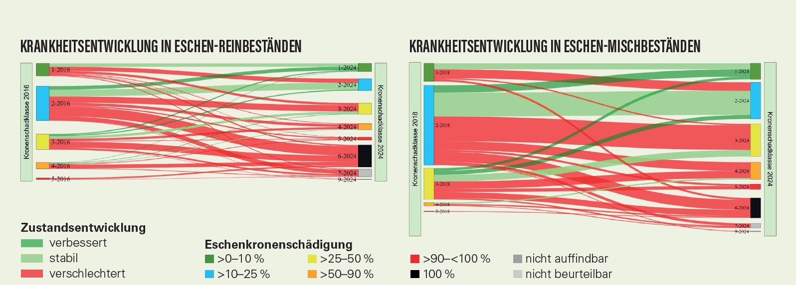 Von den Bäumen im Reinbestand, die 2016 in der besten Schadklasse waren, waren 2024 noch 27 % in dieser und 33 % in der nächstbesten Schadklasse. Mehr als die Hälfe der anfangs gesund erscheinenden Bäume (60 %) hatten nach acht Jahren Monitoring immer noch eine Kronenschädigung, die weniger als 25 % des Kronenvolumens betraf.