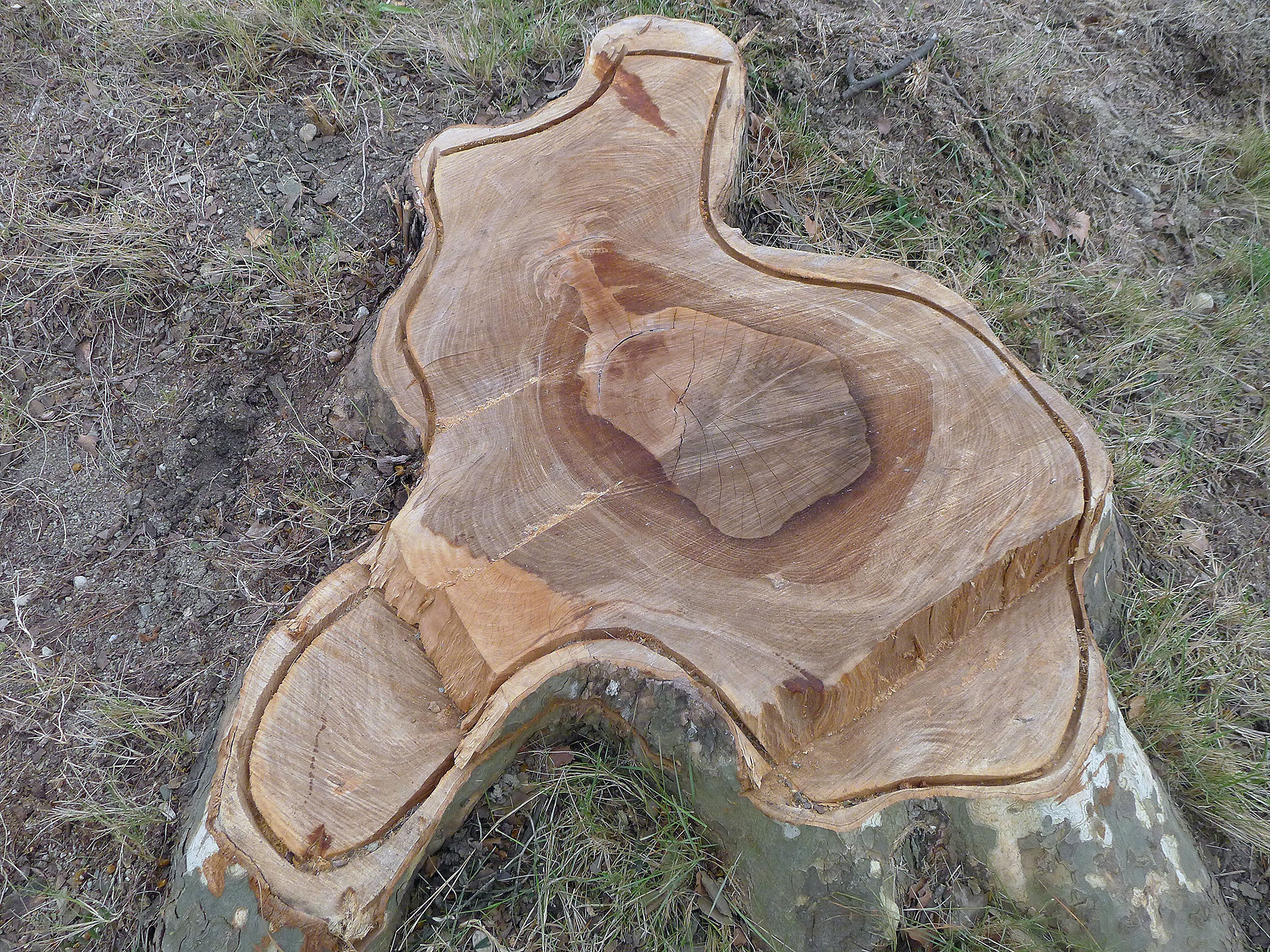 - Empfohlen wird auch dringend die Rodung und Verbrennung der Wurzelstöcke. Da dies jedoch oft an technische Grenzen stößt, wird in Frankreich ersatzweise eine „Devitalisierung“ im Boden verbleibender Stöcke praktiziert. Dazu wird mit der Motorsäge in den äußeren Randbereich der Stockoberfläche eine Fuge geschnitten, in die ein – in Frankreich für diesen Zweck zugelassenes – Pflanzenschutzmittel eingebracht wird (Abb. 3).