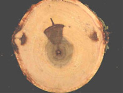 An älteren Trieben und Ästen, jedoch auch an dicken Stämmen entstehen wenige Zentimeter große Läsionen, die normalerweise in der folgenden Vegetationsperiode gesund überwallt werden (Abb. 4). Allerdings bleiben dann T-Flecken und oxidative Verfärbungen (Fehlverkernungen) im Holz zurück (Abb. 5).