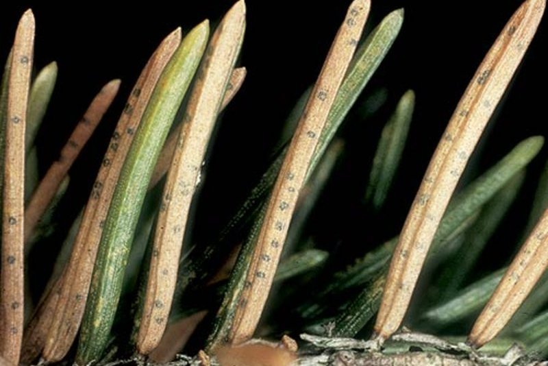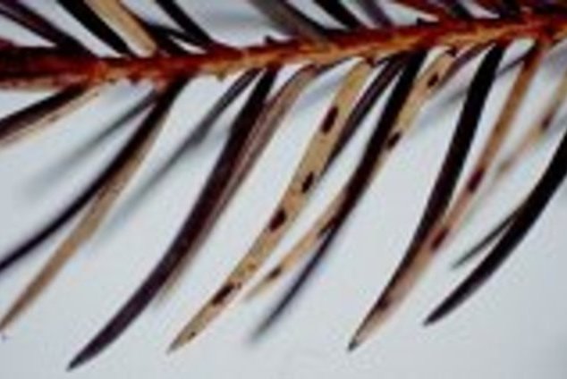 Abb. 1. Der Fichtennadelblasenrost (Chrysomyxa rhododendri) verursacht auffällige Symptome an Fichtennadeln. Foto: Ulrich Wasem (WSL)