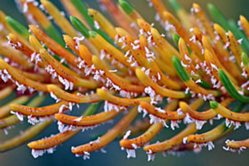 Abb. 2. Nahaufnahme von Nadeln, die durch Chrysomyxa rhododendri befallen sind: Leere, häutige Sporenlager nach der Freisetzung von Aecidiosporen. Foto: Ulrich Wasem (WSL)