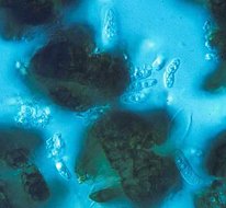 Abb. 5: Askosporen des Pilzes, die zwischen Ende Mai und Anfang Juli junge Nadeln befallen.