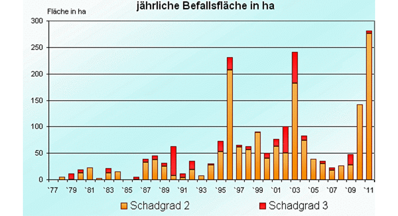 Ablesbar an den jährlichen Forstschädlingsmeldungen (Abb. 4) kam es in den vergangenen Jahrzehnten in Rheinland Pfalz sowie in Baden-Württemberg in den Frühjahren 1996, 2003 und 2011 zu wirtschaftlich fühlbarer, teilweise sogar bestandesbedrohender Befallsintensität.