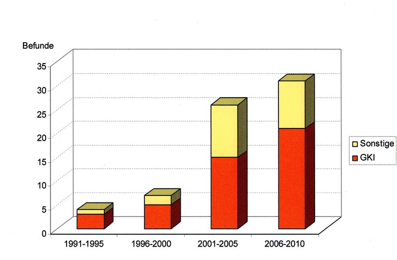 Während das Diplodia-Kieferntriebsterben im Verlauf der Jahre mit unterschiedlicher Intensität registriert wurde, hat sich das neuartige Eschentriebsterben zu einem permanent schwerwiegenden Problem entwickelt. H. pseudoalbidus wurde erst vor kurzer Zeit beschrieben (Queloz et al. 2010). Der genannte Pilz war bisher nicht als Krankheitserreger bekannt. Inzwischen hat sich das Eschentriebsterben in allen Landschaftsbereichen des nordostdeutschen Tieflands umfangreich etabliert. So entfallen im Jahr 2009 ca. 80 % der im Forstschutzmeldewesen für die Kategorie Trieberkrankungen ermittelten Schadfläche auf die Gemeine Esche (Land Brandenburg).