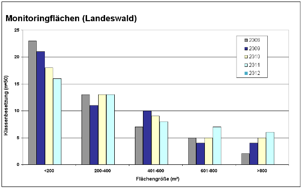Auffällig ist eine Erhöhung der größeren Flächenkategorien insbes. 200-400 m² und größer 601-800 m². Bei der Kategorie >800 m² sind bestandesauflösende Strukturen nachweisbar, die Neuaufforstungen notwendig machen. Ein Ende des Befallsfortschritts ist aus derzeitiger Sicht nicht erkennbar, vielmehr ist ein Anwachsen der Schadflächen bis zu einer noch unbekannten Flächengröße zu erwarten.