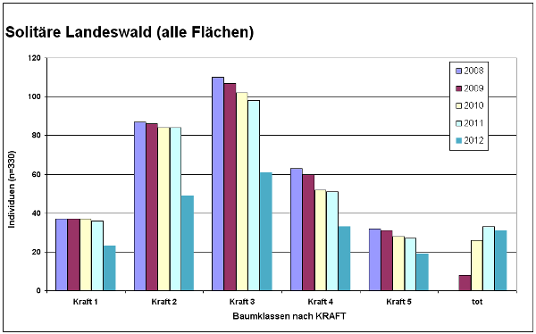 Trotz der hohen standörtlichen Disposition und Aggressivität des Erregers überleben einzelne symptomfreie Individuen in den Absterbelücken, welche nach ihrer plötzlichen Freistellung vorwüchsig und vital erscheinen. Wie Abbildung 2 verdeutlicht, entspricht ihre soziologische Einstufung annähernd einer Normalverteilung. Es dominieren die KRAFT´schen Baumklassen 2 bis 3 mit rund 60% der Stammzahl. Der Anteil vorherrschender und unterdrückter Individuen ist mit 12 bzw. 10 % in etwa gleich.