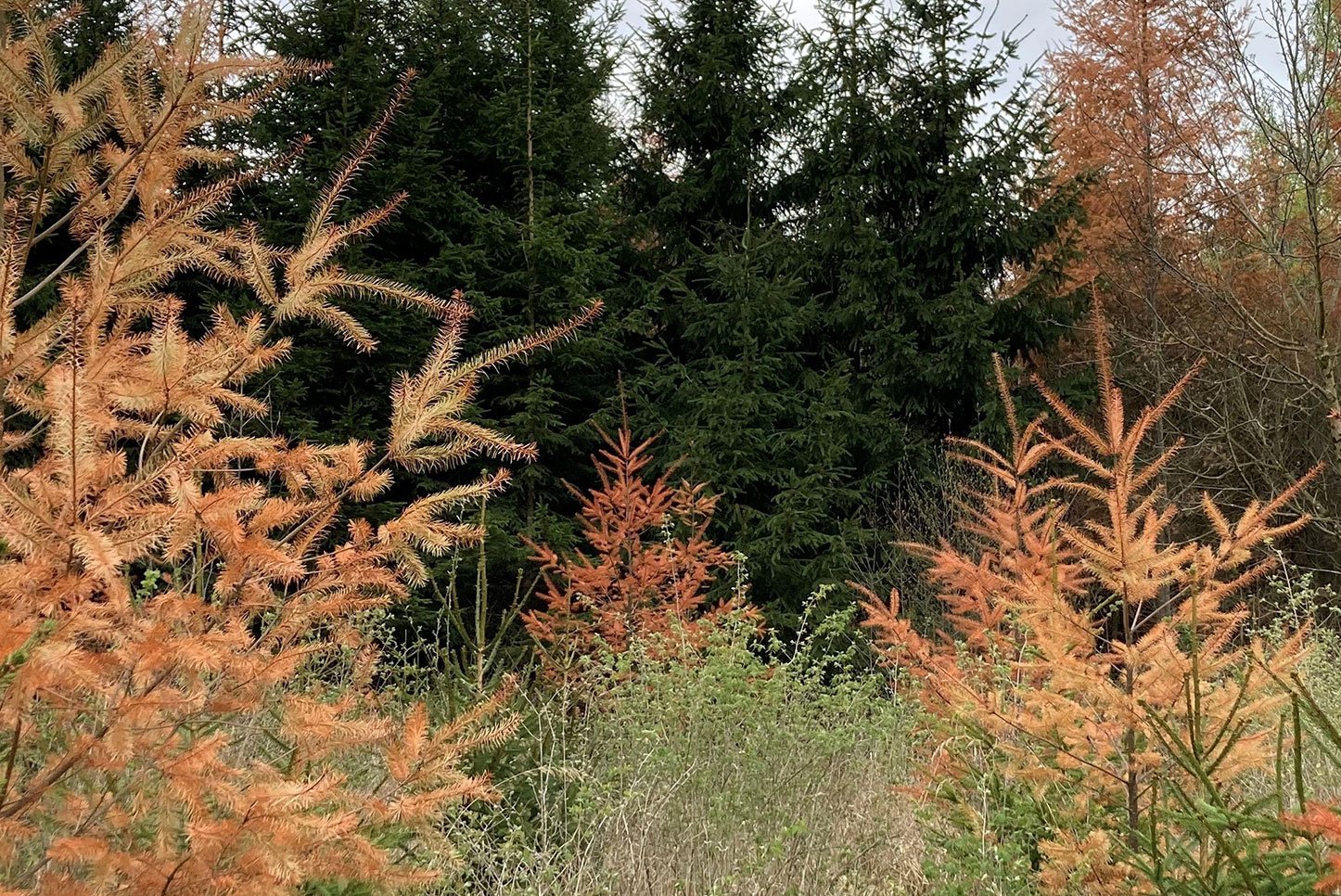 Regelmässig werden junge Douglasien mit roten Wipfeln beobachtet. Es handelt sich meist um die sogenannte Rindenschildkrankheit der Douglasie, die durch den Pilz Phacidium coniferarum ausgelöst wird (Abb. 4). Dieser Pilz befällt die Rinde von Zweigen und Stamm, wodurch diese abstirbt. Die Versorgung der höher liegenden Baumpartien wird dadurch unterbrochen, und die Nadeln der nicht mehr versorgten Baumpartien verfärben sich rot. Durch die Rindenschildkrankheit sind insbesondere junge Douglasien gefährdet, welche bereits durch Frost, Wassermangel, Pflanzschock, Rinden- oder Hagelverletzungen, starken Nadelschüttebefall oder andere Stressfaktoren geschwächt sind. Die grössten Ausfälle treten häufig im ersten Jahr nach der Pflanzung auf, wenn eine Schwächung durch Wassermangel und Frosttrocknis die Ausbreitung des Pilzes im Gewebe erleichtert.