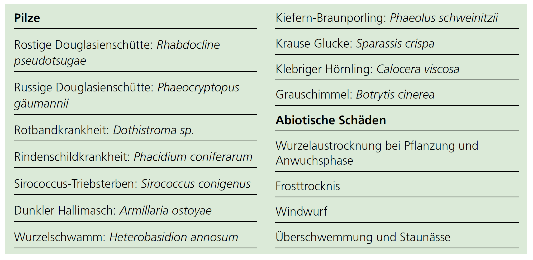 Tab. 1 - Pilze und abiotische Schäden an der Douglasie – eine Übersicht