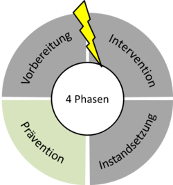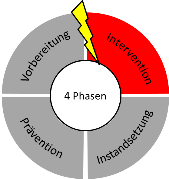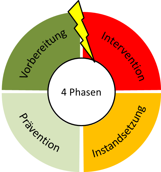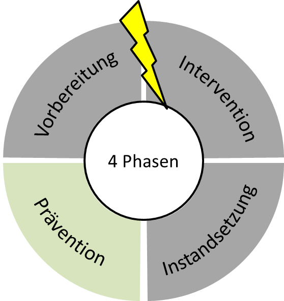 Der 4-phasige Krisen-Management-Zyklus zeigt alle notwendigen Schritte im Umgang mit Krisensituationen auf und lässt sich in einen reaktiven (Intervention und Instandsetzung) und einen präventiven Teil (Prävention und Vorbereitung) gliedern: