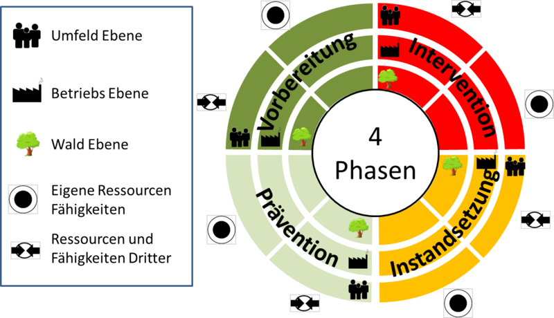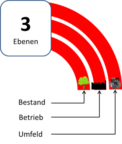 Neben den Waldbeständen als Austragungsort der Krisenbewältigung dürfen als weitere Ebenen auch der Gesamtbetrieb und das weitere Umfeld nicht außer Acht gelassen werden (Abb. 6).